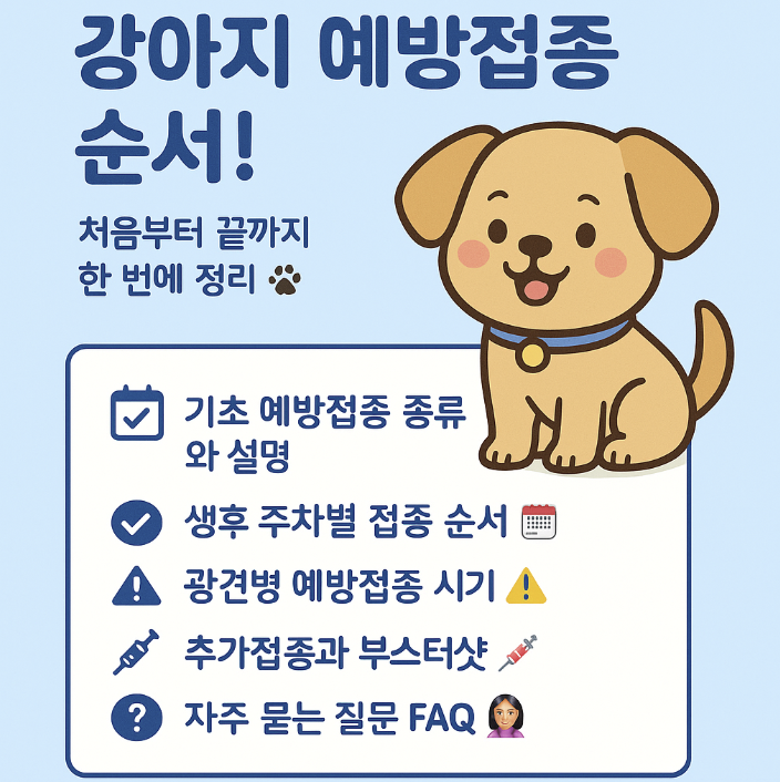 오늘은 강아지 예방접종의 순서부터 종류, 비용까지 처음 키우는 분들도 알기 쉽도록 정리해 보았어요! 처음엔 어려워 보이지만, 하나씩 차근히 따라가면 우리 강아지가 건강하고 안전한 생활을 할 수 있는 가장 기본적인 첫걸음이랍니다.